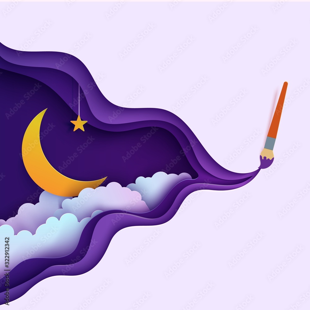 Night Sky In Paper Cut Style Cut Out 3d Background With Violet And Blue Gradient Cloudy